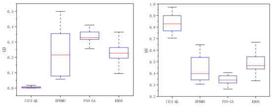 Comparison of GD and HV results for IICA-QL, BPBMO [], PSO-GA [], and KBOA [].