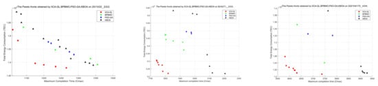 To further illustrate the performance of the compared algorithms, Figure 11 presents the Pareto results obtained by four algorithms on small-scale (25/13/22_2/2/2), medium-scale (82/42/71_3/3/3), and large-scale (202/104/175_4/3/4) instances. As shown in the figure, the Pareto front obtained by IICA-QL outperforms those of the other three algorithms across different instances, indicating that IICA-QL is able to achieve non-dominated solutions with lower makespan () and total energy consumption (TEC) compared to BPBMO, PSO-GA, and KBOA. This further validates the effectiveness of IICA-QL in both convergence and diversity across different problem scales, as it consistently generates higher quality solutions with a broader coverage of the Pareto front.