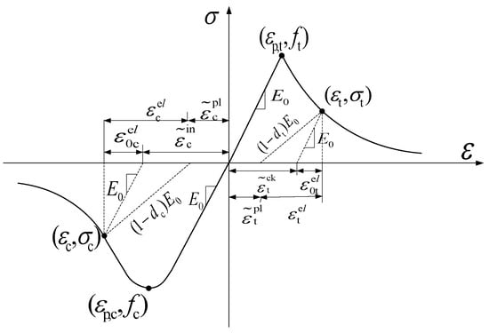 dt and dc are damage variables of concrete under tension and compression, respectively, which could be derived as and based on the Sidoroff energy equivalence principle [29], E0 is concrete’s initial modulus of elasticity; εt and εc are the tensile and compressive strains of concrete, respectively; and are the equivalent plastic strains of concrete.