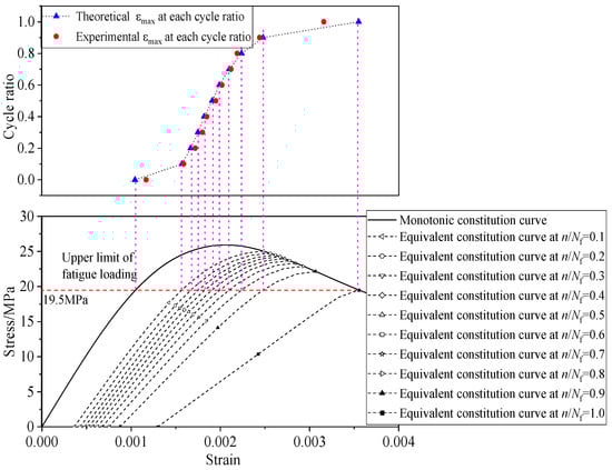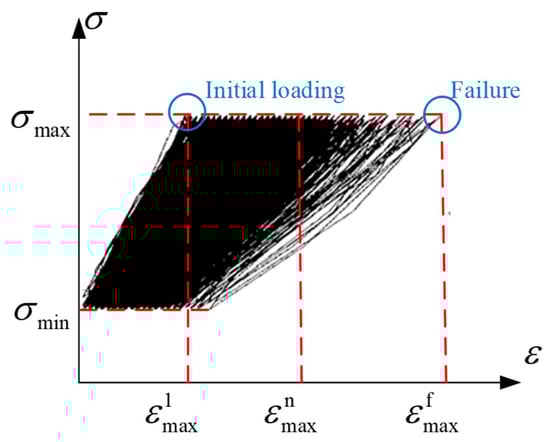 is the maximum fatigue strain during the first loading cycle, corresponding to the strain at maximum fatigue load; is the maximum fatigue strain during the nth loading cycle; is the maximum fatigue strain during the last loading cycle when fatigue failure occurs. These fatigue strains are shown schematically in Figure 2.