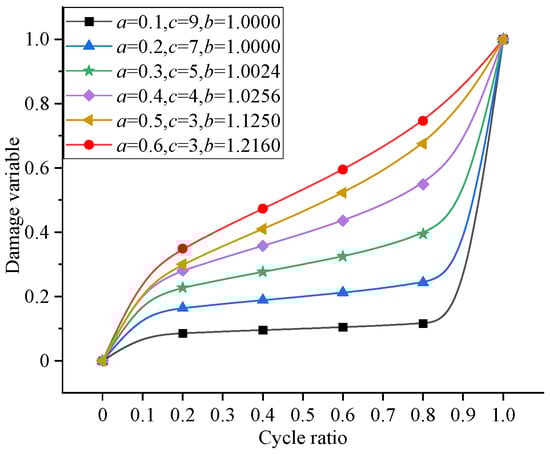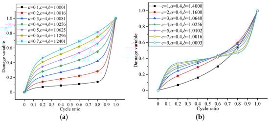 Since Equation (21) is a power or exponential function of a and c, parameter b is called the composite factor. The analysis of critical parameters can be simplified to the impact analysis of a and c, whose effects on the damage variables (Figure 3) are explored by changing one parameter while keeping the other parameter constant.