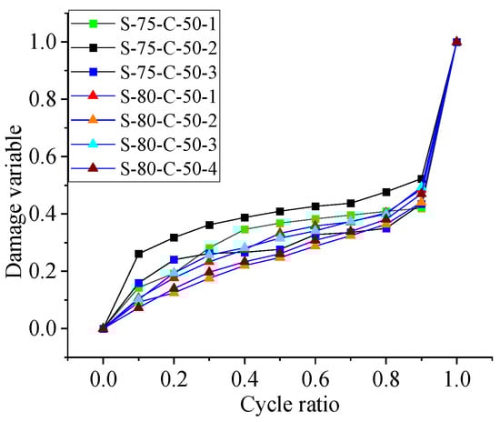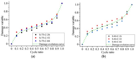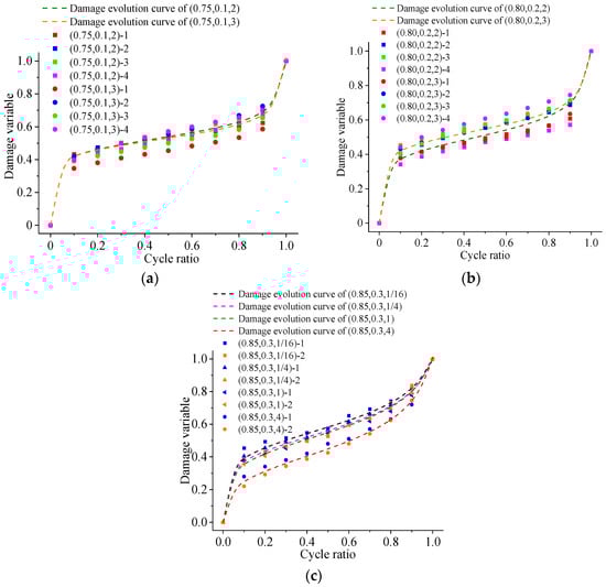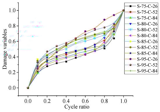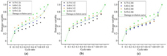 The damage variables were calculated by Equation (19), and the damage development trend of various specimens is shown in Figure 5. Specimens are designated as S-XX-C-XX, where S-XX indicates the maximum stress level, and C-XX specifies the strength grade. For example, S-75-C-26 means a specimen with a compressive strength of 26 Mpa and a maximum stress level Smax of 0.75.