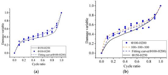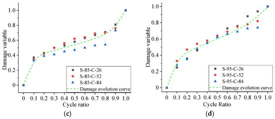 Damage variables of various specimens are meticulously grouped according to stress levels or material strength and are fitted to fatigue damage evolution equations following Equation (20). The equation parameters are listed in Table 2.