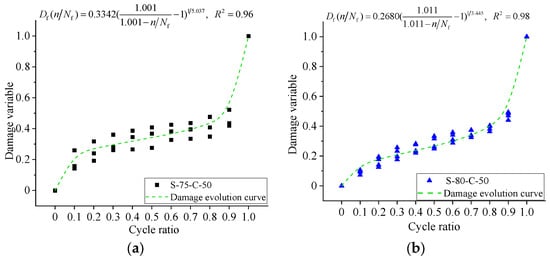 Flexural tension fatigue damage evolution curves under different maximum stress levels, obtained from fatigue test results in the literature [32]: (a) Smax = 0.75; (b) Smax = 0.80.