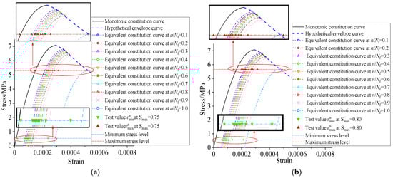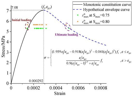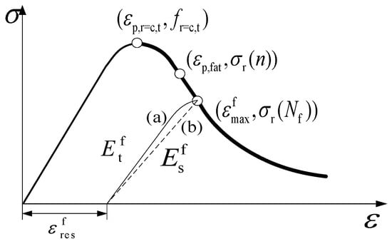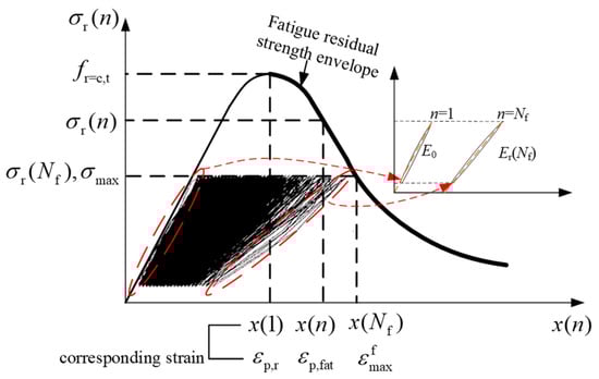 Experimental investigation demonstrates that strength deterioration of concrete in fatigue tests develops in a similar pattern with the descending branch of the monotonic stress–strain curve [14,15,16,17,18]. A typical stress–strain response under fatigue loading is depicted with a monotonic stress–strain curve, as shown in Figure 10. fr and εp,r are the ultimate strength and associated strain in the monotonic curve where r = c, t represents concrete’s compressive and tensile properties. x(n) is the ratio between fatigue peak strain εp,fat associated with fatigue residual strength after n loading cycles, and the monotonic peak strain εp,r. The accumulation of deformation and damage increases with the cyclic loading process, which induces the decrease of concrete’s fatigue residual strength σr(n) and stiffness Er(n). Fatigue failure (n = Nf) occurs when the reloading branch under cyclic loading encounters the descending branch of the monotonic loading curve, where the fatigue residual strength σr(n) degrades to the maximum fatigue stress σmax and the maximum fatigue strain at fatigue failure is approximately equivalent to the strain corresponding to the maximum fatigue stress in the descending branch of monotonic stress–strain curve [10,24].