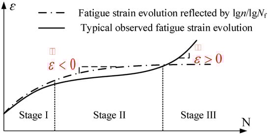 Fatigue strain evolution is generally accepted to exhibit a three-stage development pattern [24,25], consisting of an initial rapid but gradually stabilizing stage, a secondary stabilized stage, and a final rapid growth stage. Multi-segment linear [26], polynomial [27], or exponential equations [28] have been applied to fit the fatigue damage evolution. When obtaining such equations, it is not easy to guarantee clear physical meaning and satisfactory fitting accuracy simultaneously. Because each fitted parameter’s physical meaning and value range in these evolution equations have yet to be identified, the regression equation derived from a specific experiment might apply poorly to other experimental data with a large dispersion of fitted coefficients. The applicability of a regression equation to other experiments with similar loading conditions remains to be verified.