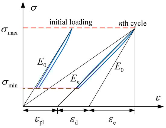 The progressive accumulation of internal damage causes concrete performance degradation at the macro level. Macroscopic mechanical properties of concrete evolve as fatigue loading progresses; the evolution of these concrete properties can then represent internal fatigue damage. Different parameters, such as maximum fatigue strain [19], residual strain [20,21], secant modulus of elasticity [22], and residual strength [23], have been defined as concrete damage variables. Maximum fatigue strain (corresponding strain when the upper limit of fatigue loading is reached) reflects the deformation under fatigue loading and is convenient to measure in experiments [24]. Thus, defining concrete fatigue damage variable through maximum fatigue strain is valuable in revealing the damage deterioration mechanism [19]. However, the maximum fatigue strain measured during the first loading cycle is more significant than that generated in subsequent fatigue cycles due to initial defects such as pores and microcracks within the material. Initial damage induced by initial defects and preloading also shows strong dispersion affected by the manufacturing process and loading conditions. Therefore, defining fatigue damage variable with damage exclusively generated by fatigue loading is desirable.
