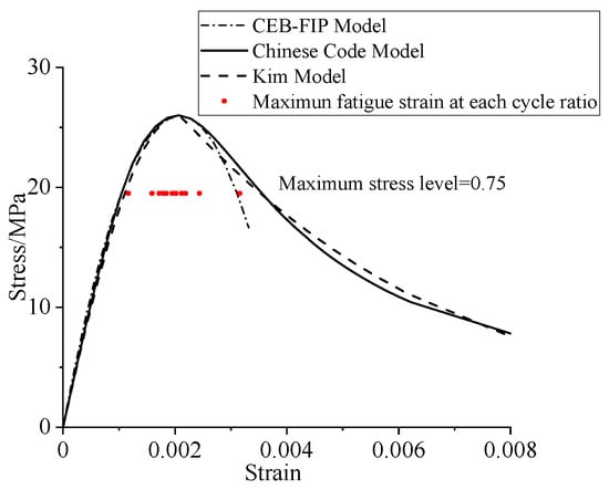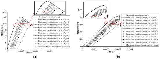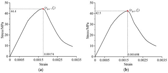 Simulated monotonic stress–strain curves of concrete cylinders in fatigue tests under axial compression from the literature [42]: (a) Specimen F1; (b) Specimen F3.