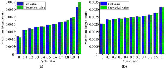 With the obtained ultimate bending capacity, a numerical analysis of the fatigue behavior of specimens C39A5 was conducted at maximum stress levels of 0.80 and 0.75 and a stress ratio of 0.1, with a loading frequency of 5 Hz. Based on the equivalent fatigue damage constitutive model, the simulated strains corresponding to the maximum and minimum stress levels are obtained and compared with test values, as illustrated in Figure 28.