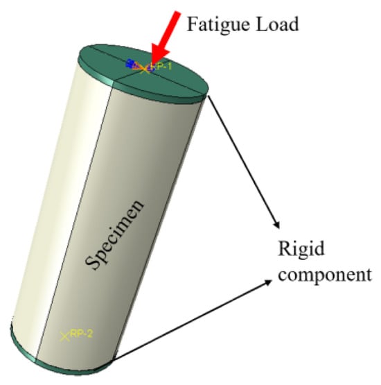 Figure 23 shows satisfactory simulation results for both specimens F1 and F3, and the relative errors between the simulation and experiment values of the two specimens do not exceed 7%. The RMSE of simulation and test values in Figure 23a is 0.04, and 0.02 in Figure 23b. This application example demonstrates that the fatigue damage evolution equation constructed based on the literature [31] could reflect the performance degradation of materials under similar conditions, and the proposed equivalent fatigue damage constitutive model could be applied to simulate fatigue loading under axial compression reasonably well.
