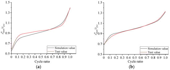 The ratio of the maximum fatigue strains to the peak strain for fatigue loading is reported in the literature [42]. Maximum fatigue strains under axial compression fatigue loading were obtained from simulation by incorporating the equivalent fatigue damage constitutive model into Abaqus. These maximum fatigue strains at specified cycle ratios are then divided by the simulated peak strain in Figure 22. The comparison between the numerical simulation results and experimental results of is presented in Figure 23.