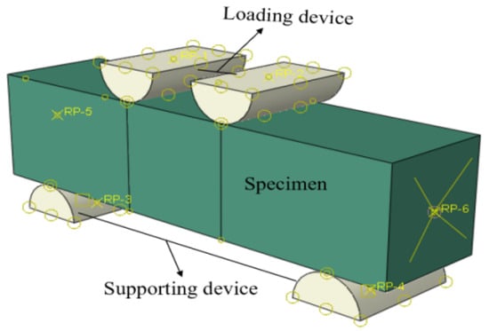 The finite element model of specimen C39A5 is shown in Figure 26, whose dimensions are identical to the 100 mm × 100 mm × 400 mm beam in the four-point bending fatigue test from the literature [47]. The loading and supporting device are rigid, and the concrete specimen is defined as deformable solid C3D8R elements. Tangential and normal behavior contact properties are set when defining the interaction between the supporting device and concrete specimen, and “Tie” constraints are defined between the loading device and the contacting nodes on the upper surface of the specimen.