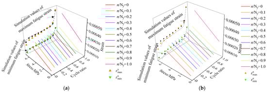In Figure 28, the solid lines stand for the specimen’s simulated fatigue stress–strain responses at each predetermined cycle ratio when it is fatigue-loaded between Smin and Smax; the black dots are the projection of the ends of these space curves into the cycle ratio versus strain plane, representing the maximum and minimum fatigue strains, respectively. Regular and inverted triangles symbolize the measured values of maximum and minimum strains from the fatigue test.