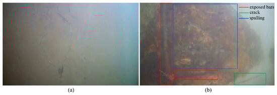 The defective regions of the underwater defective images were labeled using labelImg v1.8.1 visual annotation software to obtain data labels of the image defect information for learning by the object detection network. The labeled underwater defective image data were aggregated as the network training dataset, and some images with fuzzy features and poor quality were removed. A total of 2800 underwater defect images were obtained, of which 1600 were crack images, 600 were spalling images, and 600 were exposed bar images.