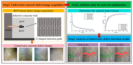 The main steps of this study regarding the underwater defect detection method are shown in Figure 2. The detection process is divided into three steps: (1) underwater concrete defects image acquisition; (2) ablation study for network optimization; (3) analysis of underwater defect detection results.