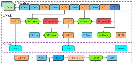 The structure of YOLOv8s consists of backbone, neck, and head parts. The backbone part uses the CSPDarkNet structure, including Conv, C2f, and Spatial Pyramid Pooling-Fast (SPPF) modules, which are mainly used for feature extraction of images. The neck part is a crucial component that connects the network backbone and the detection head, primarily responsible for feature fusion and processing to improve detection accuracy and efficiency. The neck part upsamples and fuses channel information from the backbone, sending the detailed information to the detection head for loss calculation and result prediction. The head part of the network adopts a decoupled head structure, which assigns the classification and regression tasks to different branches to improve the accuracy and stability of the prediction.