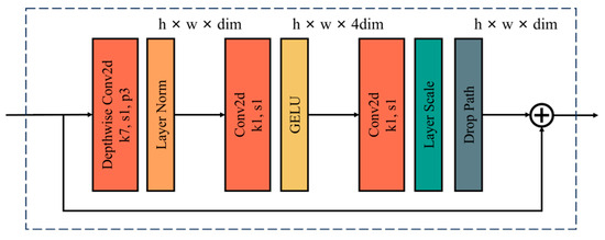 ConvNeXt [47,48] is a pure convolutional model based on the ResNet50 model and improved with reference to the structure of Swin Transformer, and the ConvNeXt Block is the core module of the ConvNeXt network structure, whose structure is shown in Figure 4. ConvNeXt Block adopts the grouped convolution idea, where the number of channels of the input feature maps determines the number of convolution kernels, and each convolution kernel processes a corresponding channel and generates a feature map. All the generated feature maps are stacked in the channel dimension, thus maintaining the same number of channels for both input and output feature maps. Meanwhile, ConvNeXt Block introduces an inverse bottleneck layer structure, which is characterized by two narrow ends and a wide middle, and effectively avoids information loss through the operation of dimension up and then dimension down, which has achieved good results in practice. Compared to ResNet Block, ConvNeXt Block chooses to use Depthwise (DW) convolution and selects the same 7 × 7 large convolution kernel as a Swin Transformer Block. The activation function is also switched from the earlier ReLU to GELU, and fewer activation functions are used. In addition, the same Layer Normalization (LN) as in Swin Transformer Block is chosen, while reducing the LN used.