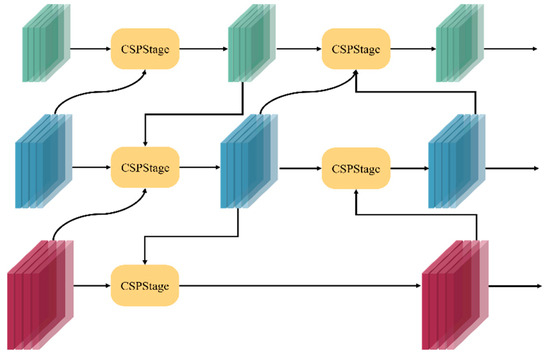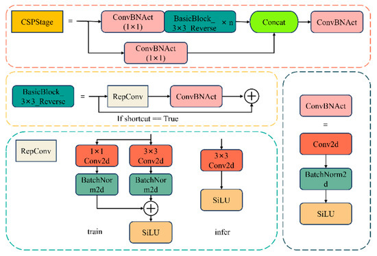 The structure of the CSPStage module is shown in Figure 6, which splits the feature learning path into two parts; one part is directly residual concatenated, and the other part undergoes a series of convolutions before being fused with the first part. This design helps to extract and fuse different levels of feature information, thus enhancing the feature representation. The structure-heavy, parameterized convolution known as RepConv is also employed. This approach utilizes a two-branch structure during training, which is fused into a single branch during inference, thereby reducing inference time.