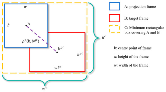 where A denotes the prediction box; B denotes the object box. IoU measures the degree of overlap of the two boxes by calculating the ratio of the intersection and concatenation of the areas of the two boxes A and B. Since this method cannot reflect the coordinate relationship between the two boxes, YOLOv8s adopts complete-IoU (CIoU) as the regression loss function. CIoU improves the regression accuracy by simultaneously considering three factors: overlap area, centroid distance, and aspect ratio of the box. The calculation of CIoU is shown in Figure 8, and it can be expressed as follows: