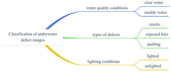Light and transparency are two factors that must be considered when acquiring optical images in a body of water. In underwater research, the light conditions directly affect the observing equipment and its use, and as the water depth increases, supplementary light sources must be added to the equipment to ensure underwater visibility. In addition, the transparency is affected by factors such as water quality, suspended particulate matter, organic matter, and algae, and a decrease in transparency may result in a blurred image. To establish a diversified underwater defect dataset, as shown in Figure 9, we considered the collection of data samples from various perspectives, such as defect types, water quality conditions and lighting conditions.