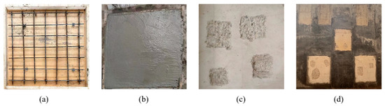 Construction process of defective concrete walls: (a) specimen molds, (b) concrete pouring, (c) defect production, (d) defective wall construction.