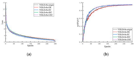 The mAP was calculated based on the area enclosed by the precision–recall curve and the axes, representing the performance of the network. The precision–recall curve displays recall on the x-axis and precision on the y-axis. A larger area enclosed by the curve and the axes indicates better model performance. The precision–recall curves for the three models, YOLOv8s, YOLOv8s-EC, and YOLOv8s-UEC, are shown in Figure 14. The black curve represents YOLOv8s, the red curve represents YOLOv8s-EC, and the blue curve represents YOLOv8s-UEC. Observing the three curves, the area under the blue curve is the largest, followed by the red curve, and the black curve has the smallest area. Clearly, as the model is continuously improved, the area under the curve increases, providing an intuitive representation of the enhanced network performance.