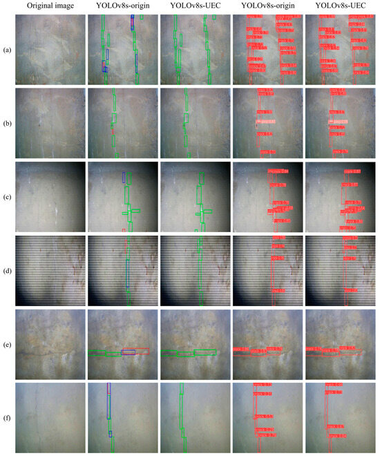 To further verify the performance of YOLOv8s-UEC, we trained other advanced networks, such as Faster R-CNN, YOLOX-s, YOLOv5s, and YOLOv8s, using the established underwater defect dataset. Each experimental group was trained until convergence to ensure optimal results, as shown in Table 4. The detection accuracy of YOLOv8s-UEC improved by 4.9%, 1.6%, 1.0%, and 1.4% compared to Faster R-CNN, YOLOX-s, YOLOv5s, and YOLOv8s. This detection capability met the requirements for efficiency and precision, demonstrating higher application value.
