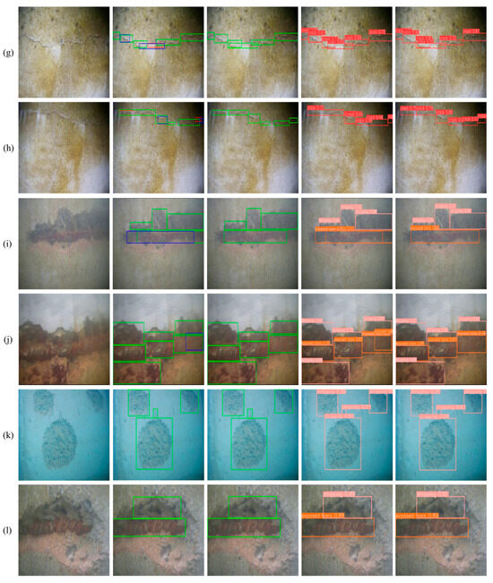 In addition, the real detection effect of the network was visualized using the ground truth as a benchmark, where the prediction boxes for correctly detected defective samples was marked in green, those for incorrectly detected non-defective samples were marked in blue, and those for missed defective samples were marked in red. Figure 15a–h presents pairs of images showing cracks in clear water without light, clear water with light, muddy water without light, and muddy water with light scenes, respectively, which shows that with the improvement of the network, the missed and incorrectly detected samples of crack defects in different scenes gradually disappeared, which proves that the effectiveness of the proposed network for detecting small objects such as underwater cracks was gradually improved. In Figure 15i,j, the detection effect of the proposed network on the three types of defects is improved, while the output prediction boxes are closer to the ground truth and more reasonable in distribution. In Figure 15k,l, the proposed network has higher confidence than the original network in detecting the same defects, which proves that the proposed network has a higher credibility in judging the defects. Taken together, the results show the proposed network can accurately detect defects of different categories and sizes in different underwater scenes, which shows that YOLOv8s-UEC has high applicability and credibility in the underwater defect recognition task.