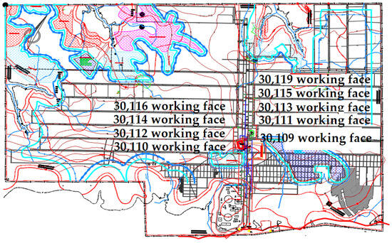 Yanghuopan Coal Mine is located in Dianta Town, Shenmu City, Shaanxi Province, and belongs to the shallow southwestern part of the Xinmin Mining Area of the Shenfu Mining Area in the Jurassic Coal Field of North Shaanxi Province. Most of the coal mine surface is covered by Quaternary System and Neoproterozoic System sediments, and the coal seams are shallowly buried. The mineable coal seams are divided into upper and lower coal groups, with two disk areas for each coal seam. The 2−2, 3−1, and 3−2 coal seams are upper coal groups, while the 4−3 coal seam and 5−1 coal seam are lower coal groups. The 30,116 face is located in the central-western part of the well field, west of the mine’s 3−1 coal 301 disk area, and the interbedded rock layers are fine-grained sandstone and siltstone, with the RQD (Rock Quality Designation) of the core of the rock being above 70% and with a good degree of completeness. The 30,119 working face is located in the east-central part of the well field, next to the 3−1 coal 301 disk area of the mine; the interlayer rock layer is siltstone and fine-grained sandstone, and the core integrity is good. The working face layout is shown in Figure 1. The surface topography of the work face is complex, with rolling beams and mounts, gullies, and ravines, and the highest elevation of the beams and mounts is +1256 m. Overlying strata on the work face range in thickness from 0 to 161.5 m, overlying strata on the cutting eye range in thickness from 10 to 66.2 m, overlying strata on the retreat tunnel range in thickness from 117 to 161 m, the bedrock ranges in thickness from 42.87 to 161.58 m, and loose layers range in thickness from 0 to 15.19 m.