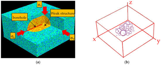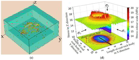 The primary technology for managing high stress involves transforming the coal and rock mass into weak structures, thus facilitating stress redistribution []. On this basis, the stress transfer theory of the coal rock cracking in weak structures is put forward: artificial fracturing of the coal and rock mass reduces its mechanical strength, forming a weak structure that lowers its load-bearing capacity and redistributes the stress and energy fields. RFPA 3D (Rock Failure Process Analysis 3D) was employed to simulate the structure and stress variation rule of the weak structure after loading [], thereby demonstrating the stress variation effect of the weak structure, as shown in Figure 2. Under further loading, the weak structure will fracture before the surrounding coal and rock, weakening the area's mechanical properties and creating a low-stress zone that shifts high stress to adjacent areas.