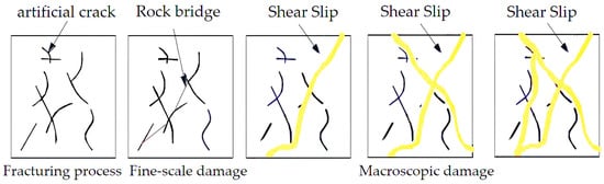 After the weak structural body is loaded, the tips of the artificial cracks will gradually crack and expand, producing a certain degree of microscopic damage. When the cracks penetrate into each other and reach the critical instability conditions of the coal rock body, the coal rock body will undergo shear slippage []; when the load is further increased, the macroscopic cracks will also be further increased and eventually form a network of cracks (as shown in Figure 3). Stress homogenization of weak structural bodies is of great significance for the prevention and control of coal rock dynamic disasters.