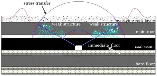 Based on the effect of stress change in weak structures, the concept of stress transfer in coal cracking of weak structures is proposed: generally, the approach employed is to drill holes into the roof, coal seam, or floor on both sides of the mining roadway or at the head of the excavation roadway and subsequently implement measures such as hydraulic fracturing in the area outside the protection of the coal and rock mass, thereby creating the requisite artificial cracks in the designated area and forming a reasonable weak structure (as shown in Figure 4).