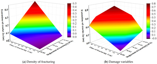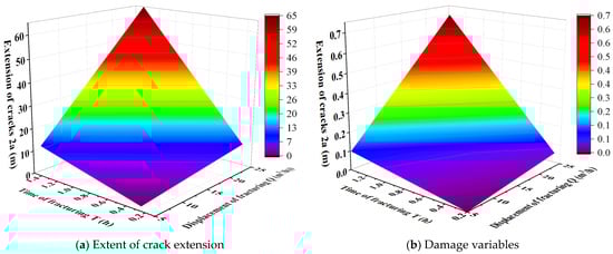 Taking Q = 7.2 m3/h, t = 0.5 h, E = 5 GPa, σ = 35 MPa, and H = 5 m, the parameters were substituted into the above equation. The effect of fracturing time T on the extension range of hydraulic fracturing cracks and damage variables was obtained as shown in Figure 7. It can be observed that as the fracturing time increases, the length of the hydraulic fractures exhibits linear growth, and the damage variable of the coal rock mass similarly increases in a linear manner.