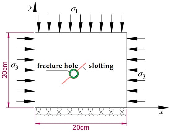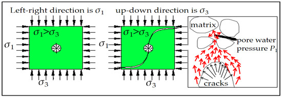 Directional hydraulic fracturing is an important technical way to preform artificial fractures in the coal rock body, and then carry out high-pressure water injection fracturing to realize the structural modification and stress transfer of the coal rock body. The directional hydraulic fracturing with preformed cracks is one of the commonly used hydraulic fracturing methods in coal mines [,]. The principle is shown in Figure 9.