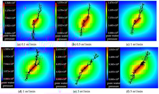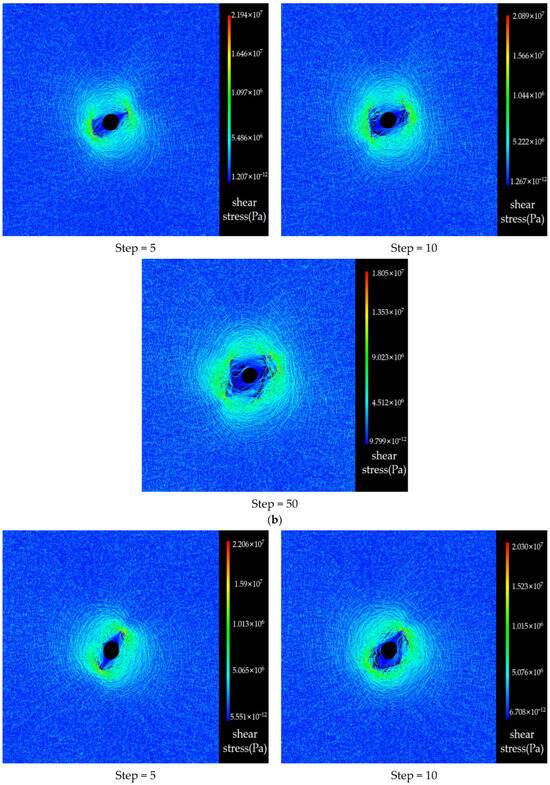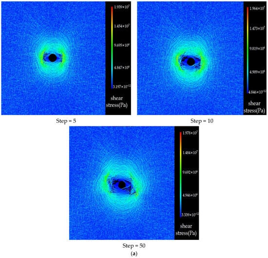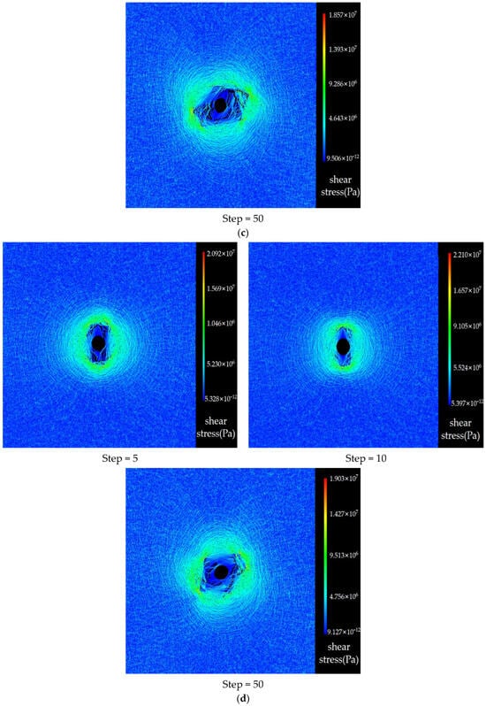 When the angle of the prefabricated crack was 30°, in the stress accumulation stage (1~5 MPa), the water pressure in the borehole was 3 MPa, and a high stress concentration phenomenon appeared at the end of the 30° crack in the borehole. With the increase in applied pressure in the borehole, at step 5 (water pressure in the borehole was 5 MPa), fine cracks formed at the crack end. At the stage of localized crack extension (5~8.5 MPa), with the increase in the applied pressure in the borehole, by step 10 (the water pressure in the borehole was 8.5 MPa), a macroscopic tiny crack formed at the crack end, and the crack gradually extended and expanded. At this point, the cracks were distributed on both sides of the borehole, and the direction of crack expansion was upward and downward, centered on the end of the crack. At the stage of crack expansion and penetration (8.5~27 MPa), when the stress in the borehole increased to 8.5 MPa (after 12 steps), the formed cracks were connected with the borehole, penetrated with the cracks, and further expanded outward to form a larger number of crack clusters, as shown in Figure 11b.