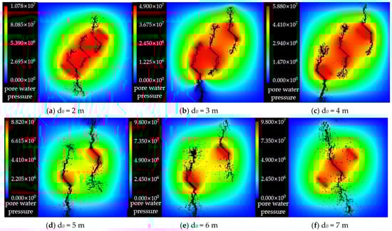 The effect of fracturing segment spacing d0 on the fracture initiation and expansion pattern of hydraulic fracturing cracks is shown in Figure 13. When d0 = 2 m, some of the lower segmented hydraulic fracturing cracks converged with the upper segmented hydraulic fracturing cracks, while the other cracks expanded independently. Unaffected by the upper segmented hydraulic fracturing cracks, 2~3 hydraulic fracturing cracks were produced eventually. When d0 = 3 m and 4 m, the hydraulic fracturing cracks all expanded independently along the direction of σ1, with no influence on each other, and finally produced three hydraulic fracturing cracks. When d0 = 5 m and 6 m, the fracturing section could only carry out two fracturing segments, and finally, two hydraulic fracturing cracks were formed. When d0 = 7 m, the fracturing section could only carry out one fracturing section and eventually formed one hydraulic fracturing fracture. Overall, with the increase in segment spacing, the number of hydraulic fracturing cracks produced first increased and then decreased. The number of hydraulic fracturing cracks was highest when the segmentation distance was 3 m. With the increase in segment spacing, the damage variable of the weak structural body increased and then decreased, and the damage variable was the largest when the segment distance was 3 m. The damage variable of the weak structural body increased and then decreased with the increase in segment spacing. The reason for this is that overly small and overly large segment spacing will result in a decrease in the number of hydraulic fracturing cracks eventually formed, which will reduce the crack density in the coal rock body.