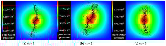 When the angle of the prefabricated crack was 60°, high stress concentration was observed at the crack end during the stress accumulation stage (1~5 MPa). At the stage of local crack extension (5~8 MPa), with the increase in pressure applied to the borehole, at step 10 (the water pressure in the borehole was 8 MPa), a macroscopic tiny crack was formed at the end of the crack, and the crack gradually extended and expanded. At this time, the cracks were distributed on both sides of the borehole to expand outward, and the whole crack extension direction was 60°. At the crack extension and penetration stage (8~27 MPa), when the borehole stress increased to 8 MPa, i.e., after 12 steps, the cracks formed were connected with the borehole, penetrated with the cracks, and further extended outward, forming more crack groups, as shown in Figure 11c.