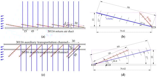 Drill hole arrangement plan for 30,116 working face hydraulic fracturing top plate management. (a) 30,116 working face hydraulic fracturing top plate management return air duct drilling layout plan. (b) Return air duct drilling section plan. (c) 30,116 working face hydraulic fracturing top plate management auxiliary transportation channel drilling arrangement plan. (d) Auxiliary transportation channel drilling section plan.