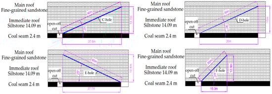 A total of 44 drill holes were constructed, categorized into four types: C (40 m depth, 20° inclination), D (30 m depth, 30° inclination), E (40 m depth, 20° inclination), and F (20 m depth, 40° inclination). The arrangement included 14 holes of type C, 14 holes of type D, and 6 holes of type F on the cut-off mining side. Additionally, 3 holes of type D and 2 holes of type E were placed in the transportation chute, while 3 holes of type D and 2 holes of type E were installed in the return chute. The layout for cut-off hydraulic fracturing and initial roof placement in the 30,119 working face is illustrated in Figure 17.
