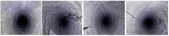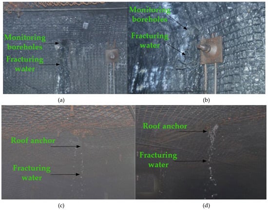 When most of the drill holes in the 30,116 return wind trench were pressed to the position of 11~17 m from the mouth of the borehole (most of the drill holes in the auxiliary transportation trench were pressed to the position of 20~29 m from the mouth of the borehole), the anchor ropes started to produce water. The closer the drill holes were to the borehole mouth, the greater the fracturing out of water, as shown in Figure 18a,b. This reflects that the surrounding rock above 17 m (29 m) of the borehole is relatively hard and complete and the fractures did not develop; under the action of high-pressure water, the fractures were also extended and diffused and new fractures were generated. The fractures in the surrounding rock below 17 m (29 m) were more developed, the penetration under the action of high-pressure water was better, and a fracture network was formed, as shown in Figure 19. Most of the fracturing values are distributed between 10 and 25 MPa, without an obvious pressure drop, and the phenomenon of neighboring holes drenching during the fracturing indicates that the cracks were extended to the neighboring holes, and the design of the fracturing scheme is reasonable.
