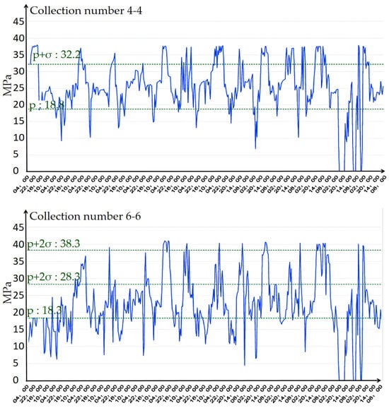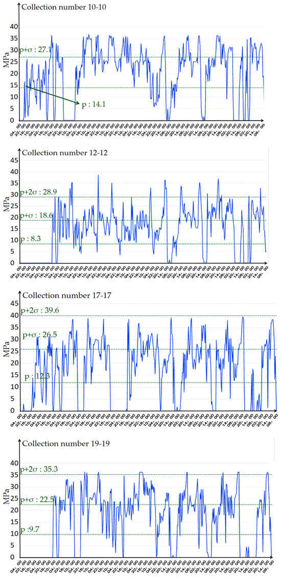 To further assess the impact of roof management in the 3−1 coal seam, pressure monitoring was performed on the brace resistance of the 30,116 working face at the Yanghuopan Mine following roof depressurization. Two monitoring channels were selected in each section of the upper, middle, and lower parts of the working face to analyze the mine pressure data (as shown in Figure 20). For data comparability, six channels—4-4, 6-6, 10-10, 12-12, 17-17, and 19-19—were used for data acquisition.