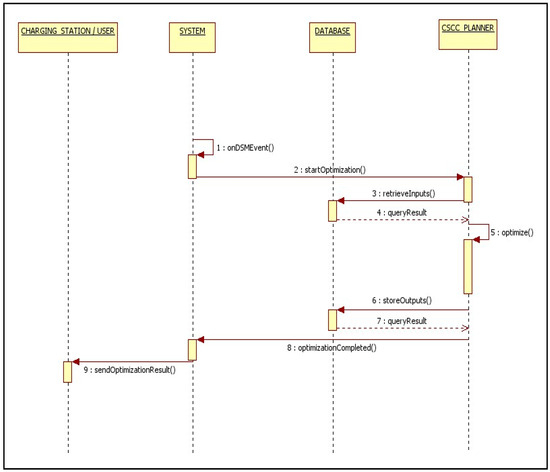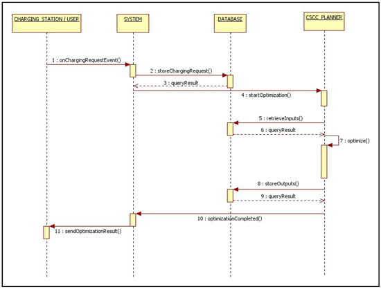 The interaction between the CSCC, EVs, and CSs follows a clear operational flow, which can be visualized in the UML diagrams. The sequence begins with a charging request (CR) sent from the user to the CSCC, followed by data retrieval, optimization, and the transmission of control signals to the charging stations. This process ensures that all EVs receive updated charging instructions tailored to current grid conditions and user preferences (see Figure 5). The following steps outline the sequence of operations that occur after a charging request is initiated at the charging station: