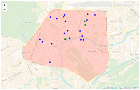 Geographic area selected for the field tests, in Ljubljana (Slovenia). The red shaded area represents the pilot study area, with blue points indicating parking houses and green points representing charging stations.