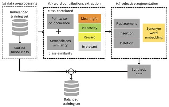 The workflow of our proposed word selection for augmentation method consists of three parts: (a) data preprocessing to provide the minor class of the cleaned dataset, (b) extracting word contributions into four categories, and (c) applying selective augmentation procedures to generate synthetic data.