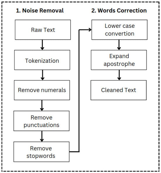 One critical step in text classification is data preprocessing []. The text is preprocessed prior to implementing the categorization algorithm. A common practice in natural language processing (NLP) is to clean sentences from noise by performing stop-word removal, stemming, and pegmatization []. In this study, we applied noise removal and word correction to clean the text, as presented in Figure 3.