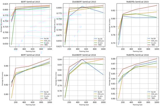 It was observed that TAWC consistently improved the low-data schemes, suggesting its robustness. The most distinct improvement occurred with the SemEval 2015 dataset under the scenario of 200 samples, where the DistilBERT average accuracy increased by nearly 4% compared with No-DA case. In contrast, for a training size of 100, EDA-w2v achieved excellent performance for all classifiers. Instinctively, most sentences in the training samples were short. Therefore, as a random-based replacement, EDA-w2v outperformed TAWC. Using the SemEval 2016 dataset, TAWC exceeded the average accuracy of the baselines in all scenarios. However, IG-w2v was slightly superior by less than 1% when applying BERT classification on 100 training sets. The highest TAWC attainment occurred within the scenarios of 200, 500, and 1000 training sizes for the two datasets with the three classification models. We, thus, found that TAWC can be applied to a small training size without compromising performance.