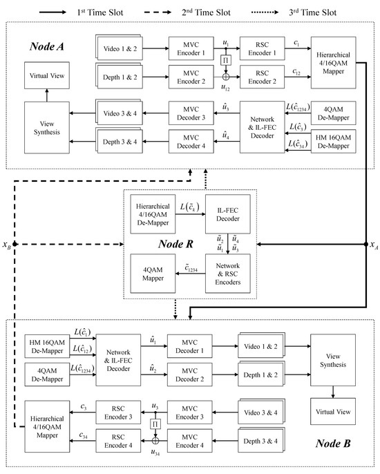 TWRC offers a promising solution for facilitating bidirectional communication between nodes exchanging MVD content by enhancing spectral efficiency and reducing latency, which is crucial for high-bandwidth applications like real-time 3D video communication [5,6,7]. However, the inherent high data rates and susceptibility to transmission errors in MVD content posed challenges that our method addressed by optimizing advanced modulation (i.e., HQAM) and error correction techniques (i.e., IL-FEC) to maintain quality and reliability.