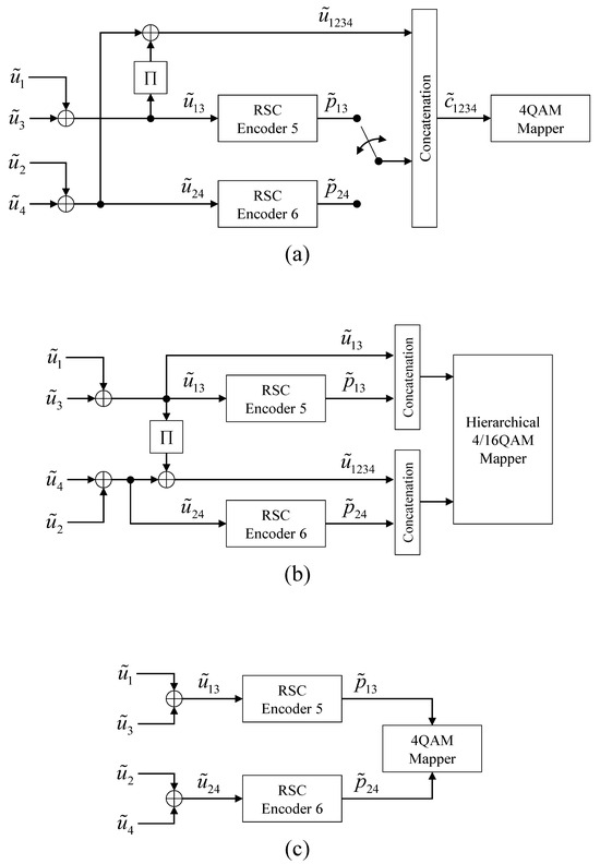 A joint network and channel encoder in node R: (a) proposed, (b) reference 1, (c) reference 2.