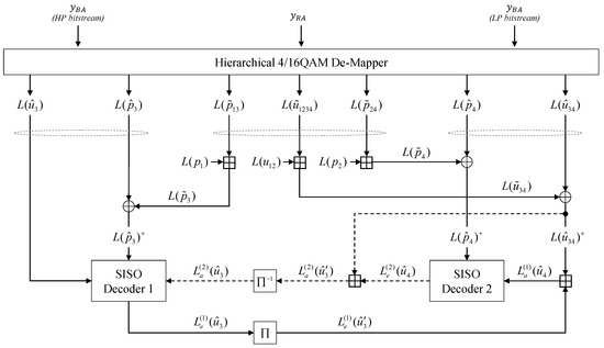 After demodulation, the soft-bit codewords are decoded by the iterative network and IL-FEC decoder, as shown in Figure 4, which illustrates the decoder for node A. The same principle applies to the decoder for node B, so it is not separately depicted. The soft-bit streams , , , and are directly received from node B, while , , and are received from node R. The proposed network and IL-FEC decoder provide a priority information (API) before the first half-iteration by using the received soft-bit streams from node R and the soft-bit streams already available at node A (i.e., , , and ). This approach differs from the conventional IL-FEC decoding process shown in Figure 4. The initial APIs are extracted using the ⊞ operation, defined as [20]. Through the extracted , , and , the directly received soft-bit streams , , and can be improved before the iterative decoding process begins.