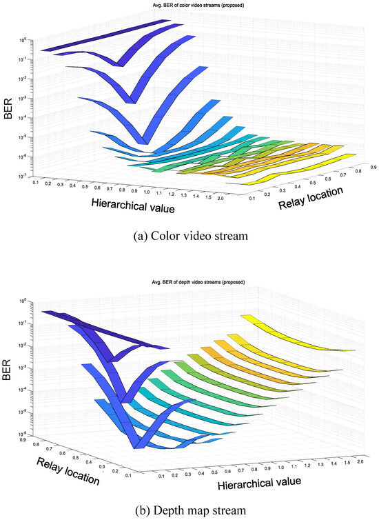 The key reason the proposed method with excels in performance for the virtually generated center view is that both the 2D color video streams and the associated depth map streams meet the target BERs simultaneously, regardless of relay location, as illustrated in Figure 6. In summary, our evaluation demonstrates that the proposed method significantly outperforms the referenced methods in terms of BER performance, particularly for color video streams. This directly translates into better video quality, as evidenced by the SSIM results.